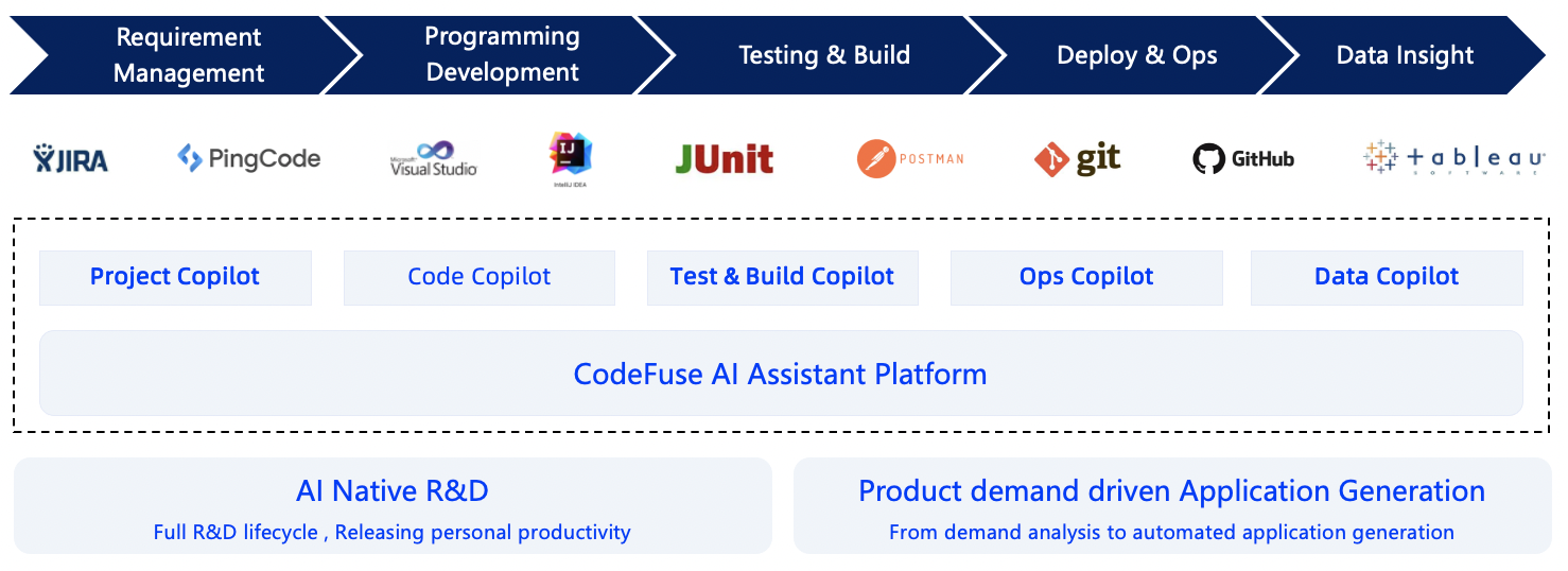 CodeFuse aims to develop Code Large Language Models (Code LLMs) to support and enhance full-lifecycle AI native sotware developing, covering crucial stages such as design requirements, coding, testing, building, deployment, operations, and insight analysis;
